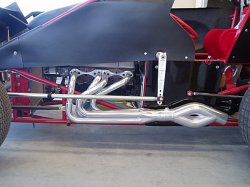 Sprint car V8 headers and Mufflers with jet hot coating.